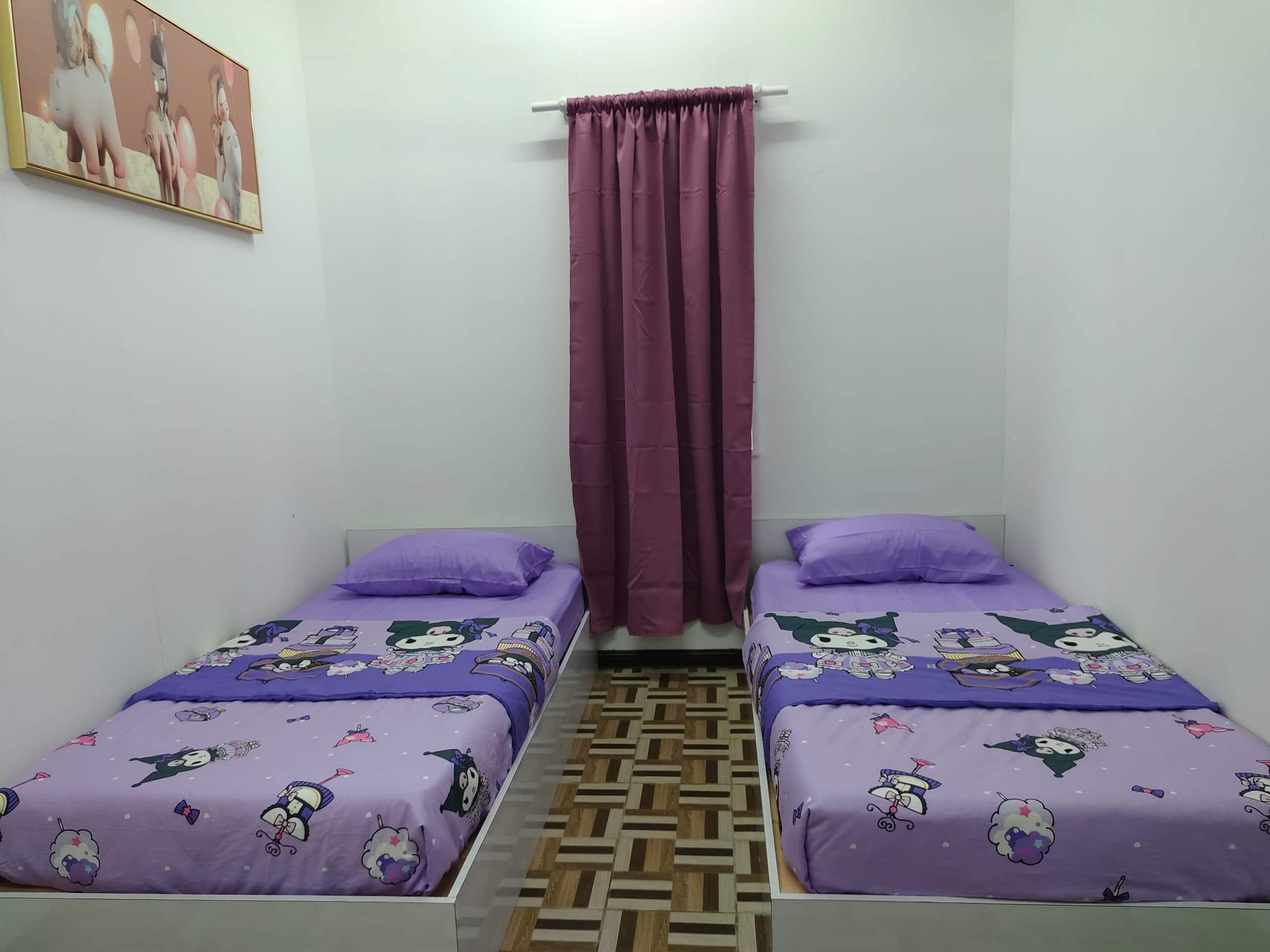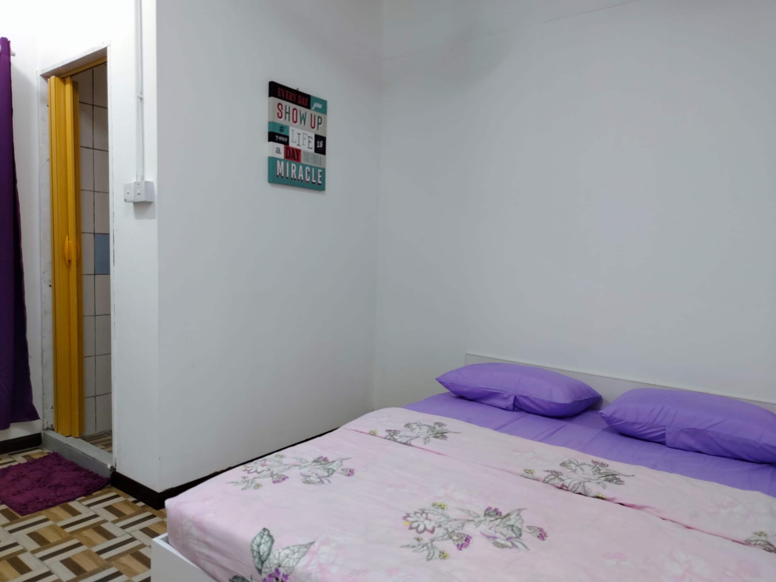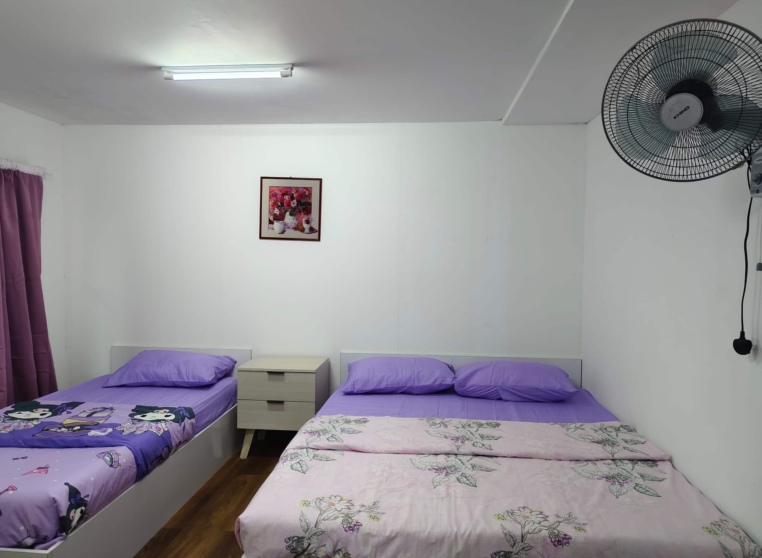 A room with 1 single bed & 1 queen size bed and a common bathroom.